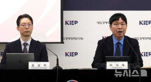 [세종=뉴시스] 강종민 기자 =  대외경제정책연구원(KIEP) 이시욱 원장(오른쪽)과 윤상하 국제거시금융실장이 13일 세종시 정부세종청사에서 열린 2025년 세계경제전망에서 올해 세계경제성장률을 지난해 성장률 대비 0.5%p 낮은 2.7%로 전망하고 있다. 2025.05.13. ppkjm@newsis.com