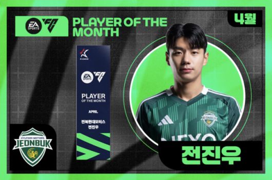 [인터풋볼] 주대은 기자 = 전북현대모터스 전진우가 K리그 공식 비디오게임 파트너 일렉트로닉아츠(Electronic Arts, 이하 'EA')가 후원하는 2025년 4월 'EA SPORTS 이달의선수상(EA SPORTS Player Of The Month)'을 수상했다
