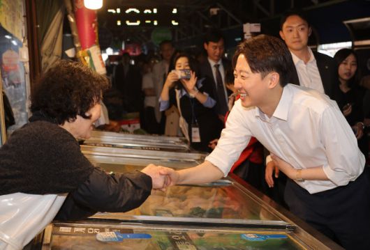 개혁신당 이준석 대선후보가 13일 대구 칠성시장을 찾아 시민들과 인사하고 있다. (사진=연합뉴스) |