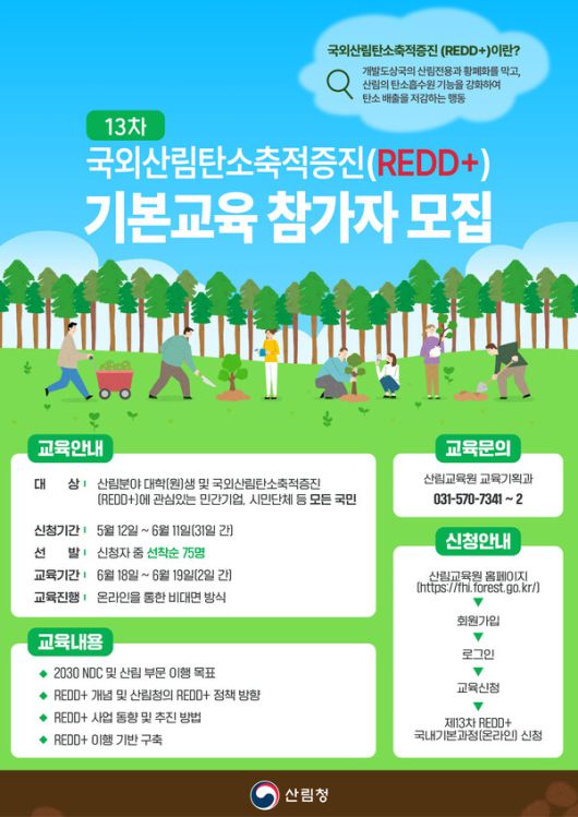 산림청은 5월 12일부터 6월 11일까지 '국외산림탄소축적증진(REDD+)' 기본과정 교육생을 모집한다고 밝혔다.