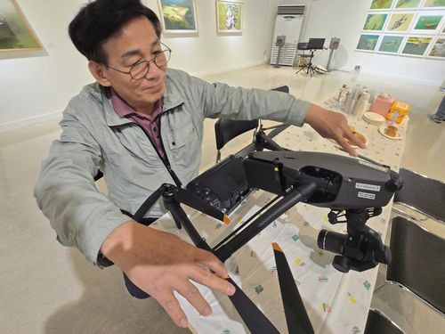 김 작가는 지난 9일부터 춘천미술관 1층에서 'Waterscape'(물속의 지형)라는 주제로 의암호의 환경을 드론으로 촬영해 보여주는 사진 38점을 전시 중이다.