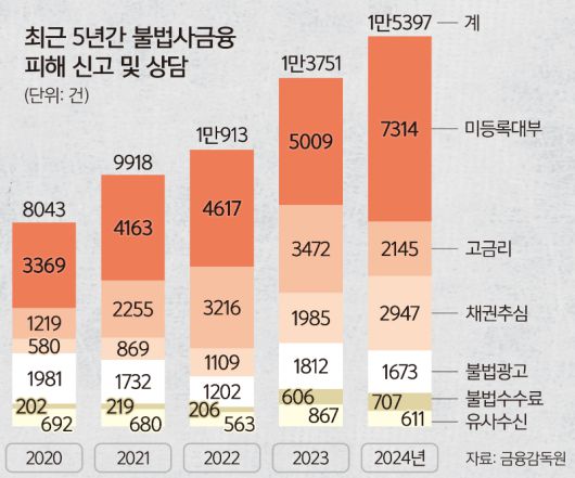 더불어민주당 양부남 의원실이 금감원으로부터 받은 불법사금융 피해신고센터 사건처리현황에 따르면, 금감원이 접수한 불법채권추심은 2020년 580건에서 지난해 2947건으로 불어났다. 이 기간 미등록 대부업체 이용은 3369건에서 7314건으로, 고금리 사례는 1219건에서 2145건으로, 불법수수료 징수 사례는 202건에서 707건으로 각각 급증했다.