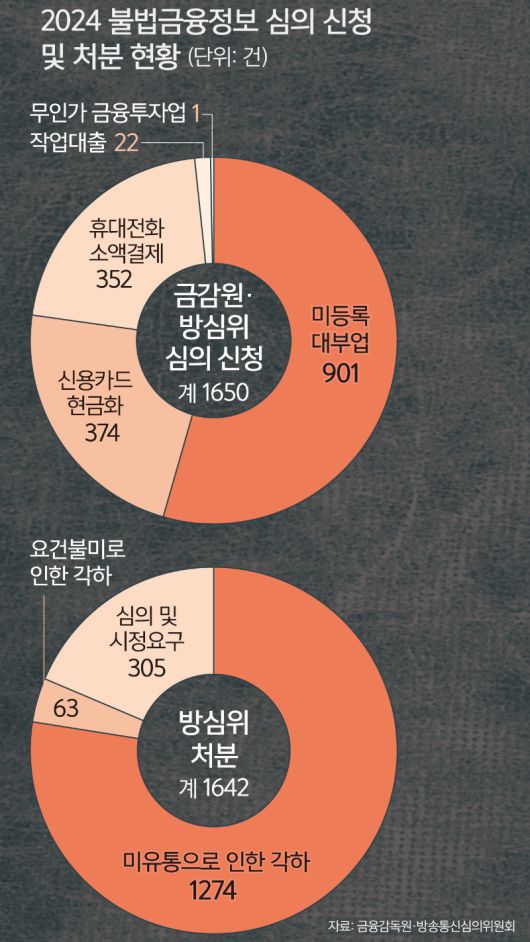 세계일보 취재결과, 지난해 신용카드 현금화와 미등록 대부업, 휴대전화 소액결제 등 불법금융투자정보 등 금감원이 심의 신청한 1650건 중 81%에 달하는 1345건이 방심위에서 각하 처리됐다. 심의요청 이후 심의를 위해 확인해 봤더니 대부분 삭제됐거나 흔적을 찾을 수 없어 각하 처리했다는 게 방심위 측 설명이다. 방심위가 심의를 위해 관련 광고의 온라인 주소를 확인했을 때 이미 사라진 정보 미유통 사례가 1274건으로 가장 많았다.