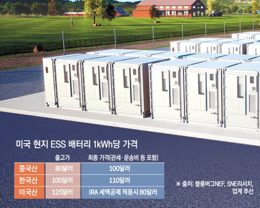 중국산 ESS 배터리는 이 정도 관세로도 미국에서 가격 경쟁력을 유지할 수 있다. 블룸버그NEF 등에 따르면 중국산 ESS 배터리 가격은 현지 기준 킬로와트시(kWh)당 80달러 수준이다. 관세와 물류비 등을 더해도 미국 내 유통 가격은 100달러 내외에 불과하다. 같은 조건에서 한국산 배터리(출고가 약 100달러)는 미국 현지에서 110달러 수준이다.