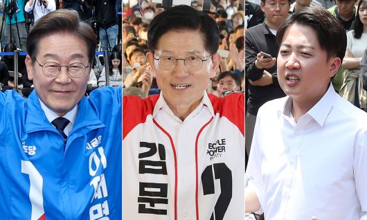 제21대 대통령 선출을 위한 공식 선거운동 이틀째인 13일 더불어민주당 이재명 대선 후보(사진 왼쪽부터)가 대구광역시 동성로 거리에서, 국민의힘 김문수 대선 후보가 울산 남구 신정시장에서, 개혁신당 이준석 대선 후보가 대구 경북대학교에서 집중 유세를 하고 있다. 연합뉴스