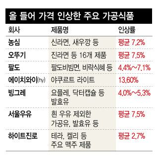 유업계 1위인 서울우유는 지난 1일부터 흰 우유를 제외한 가공유 등 54개 제품의 출고가를 평균 7.5% 올렸다. 빙그레는 이달말부터 요거트 ‘요플레 오리지널 멀티’의 가격을 5.3% 인상한다. 올초 라면·과자·음료 등에서 시작한 가공식품 인상이 5월 들어 맥주·유제품으로 번진 셈이다.