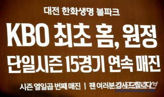 13일 대전 한화생명볼파크에서 열린 두산-한화전.KBO 최초 홈, 원정 단일시즌 15경기 연속 매진을 축하하는 메시지가 전광판에 표시되고 있다. 대전=정재근 기자 cjg@sportschosun.com/2025..5.13/