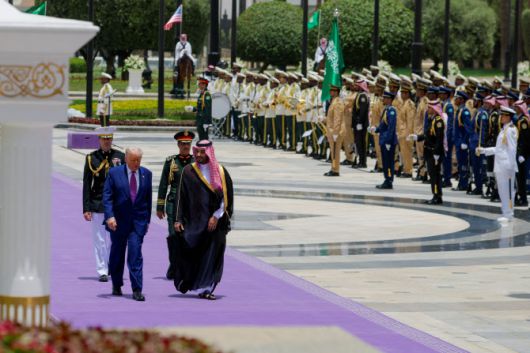 계단 꼭대기에서 주먹을 불끈 쥔 트럼프 대통령은 무함마드 빈 살만 사우디 왕세자의 환영을 받았다. 이들은 따뜻한 포옹으로 악수를 나누고 커피를 마시기 위해 근처에 있는 화려한 방으로 들어가 대화를 이어갔다. 이날 마코 루비오 국무 장관이 트럼프 대통령의 오른쪽에 배석했다.