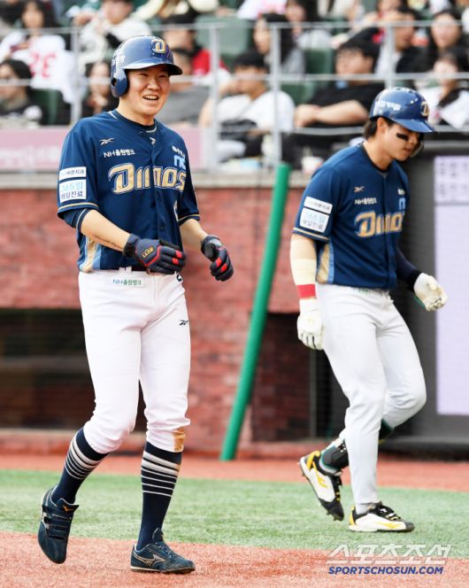13일 인천 SSG랜더스필드에서 열린 SSG 랜더스와 NC 다이노스의 경기. NC 박민우가 득점 후 미소 짓고 있다. 인천=박재만 기자 pjm@sportschosun.com/2025.05.13/