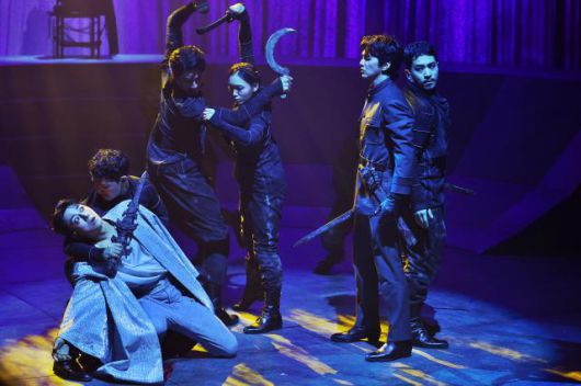 배우 손호준과 유승호가 13일 오후 서울 서강대학교 메리홀에서 열린 연극 '킬링시저' 프레스콜에서 주요 장면을 시연하고 있다.[사진=연합뉴스] |
