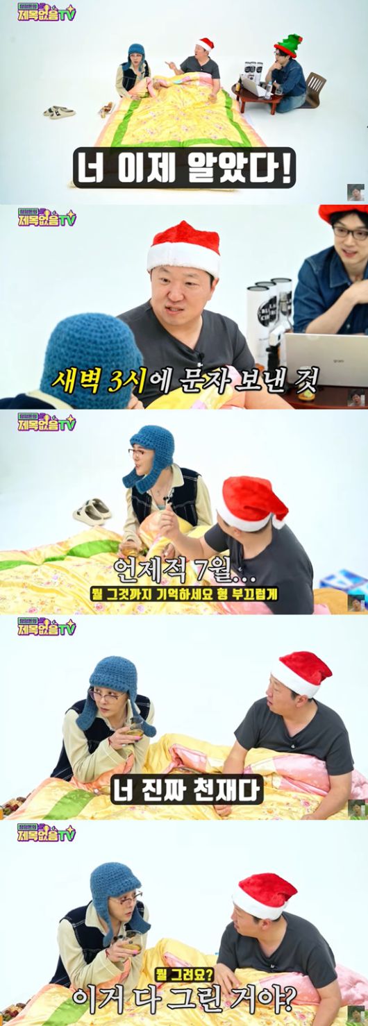 그러다 정형돈은 "너 이제 알았다. 나한테 새벽 3시에 문자 보낸 거. 7월, 8월 달에"라고 깨달은 듯 말했고, 지드래곤은 "뭘 그것까지 기억하세요 형 부끄럽게. 이제 6월이에요 좀 있으면. 1년 전 일을 다 기억하면 어떡해요"라고 너스레를 떨었다.