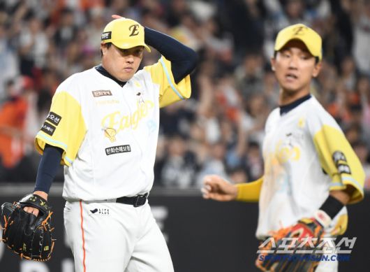 13일 대전 한화생명볼파크에서 열린 두산-한화전. 5회초 1사 2루 김인태의 내야 안타 때 2루수 황영묵이 1루 송구실책을 범하고 있다. 류현진이 아쉬워하고 있다. 대전=정재근 기자 cjg@sportschosun.com/2025..5.13/