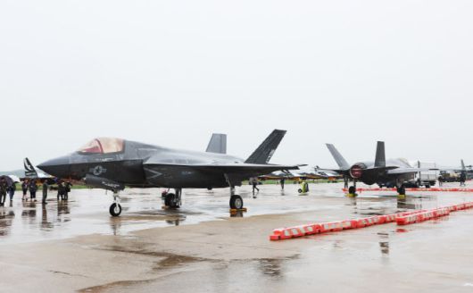 지난 9일 경기도 평택시 주한미공군 오산기지에서 열린 '오산 에어 파워 데이 2025 미디어데이'에 F-35B(왼쪽)와 F-35A 전투기가 전시돼 있다. (사진=연합뉴스) |