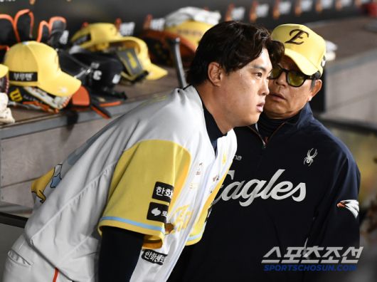 13일 대전 한화생명볼파크에서 열린 두산-한화전. 5회초 1실점한 류현진이 이닝을 마치고 내려오자 양상문 투수코치가 투구의사를 물어보고 있다. 대전=정재근 기자 cjg@sportschosun.com/2025..5.13/
