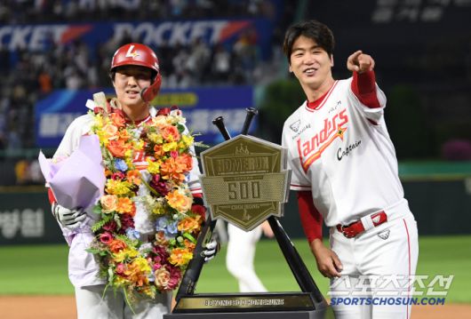 13일 인천 SSG랜더스필드에서 열린 SSG 랜더스와 NC 다이노스의 경기. 6회말 2사 1루 SSG 최정이 NC 선발 라일리 상대 투런포를 터뜨린 뒤 김광현과 포즈를 취하고 있다. 인천=박재만 기자 pjm@sportschosun.com/2025.05.13/