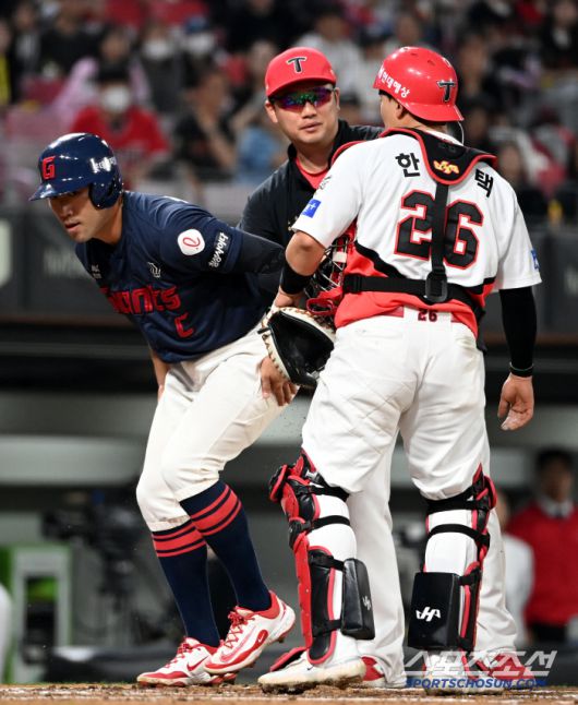 13일 광주KIA챔피언스필드에서 열린 롯데와 KIA의 경기, 6회초 1사 1,2루 롯데 전준우가 KIA 김도현의 투구를 몸에 맞자 손승락 수석코치가 나와 사과하고 있다. 광주=허상욱 기자wook@sportschosun.com/2025.05.13/