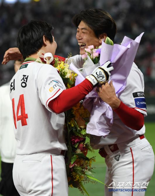 13일 인천 SSG랜더스필드에서 열린 SSG 랜더스와 NC 다이노스의 경기. 6회말 2사 1루 SSG 최정이 NC 선발 라일리 상대 투런포를 터뜨린 뒤 김광현과 포옹을 하고 있다. 인천=박재만 기자 pjm@sportschosun.com/2025.05.13/