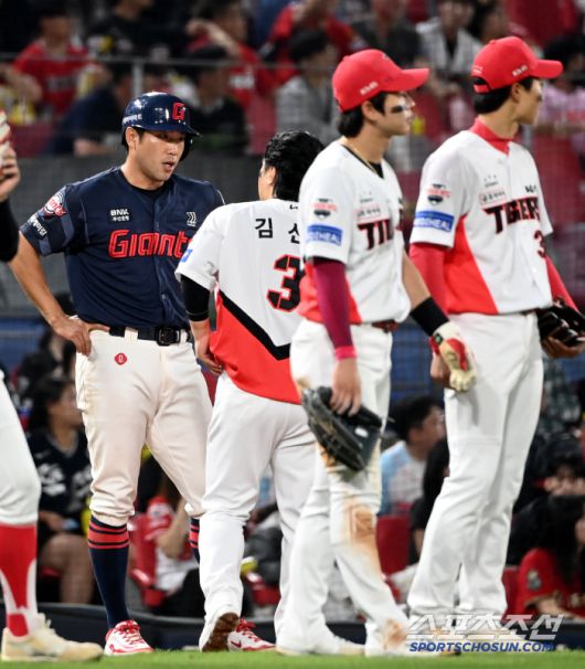13일 광주KIA챔피언스필드에서 열린 롯데와 KIA의 경기, 6회초 1사 만루 롯데 정훈의 내야땅볼때 1루 비디오 판독이 진행되는 사이 3루주자 전준우와 김선빈이 이야기를 나누고 있다. 광주=허상욱 기자wook@sportschosun.com/2025.05.13/