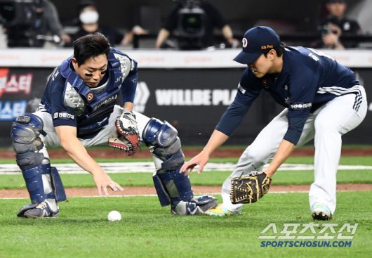 13일 대전 한화생명볼파크에서 열린 두산-한화전. 6회말 무사 1, 2루 문현빈의 번트 타구를 양의지가 잡으며 최원준의 발을 밟고 있다. 대전=정재근 기자 cjg@sportschosun.com/2025..5.13/