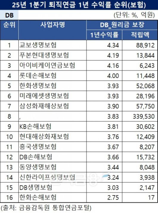 13일 한국금융신문 KFT금융연구소가 금융감독원 통합연금포털 자료를 종합 분석한 내용에 따르면, 올해 1분기 DB형 원리금보장형에서는 교보생명이 수익률 4.34%를 기록하며 1위를 기록했다.