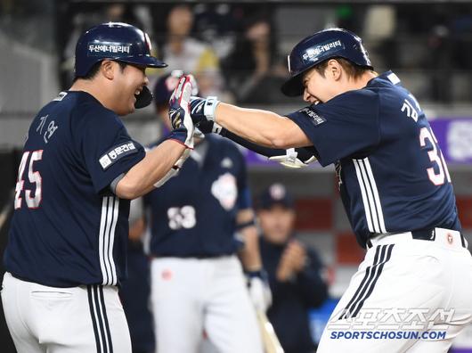13일 대전 한화생명볼파크에서 열린 두산-한화전. 8회초 2사 1루 김재환이 투런포를 친 후 김기연과 함께 환호하고 있다. 대전=정재근 기자 cjg@sportschosun.com/2025..5.13/