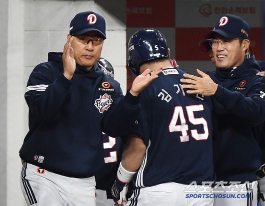 13일 대전 한화생명볼파크에서 열린 두산-한화전. 8회초 2사 1루 김재환이 투런포를 치자 이승엽 감독이 환호하고 있다. 대전=정재근 기자 cjg@sportschosun.com/2025..5.13/