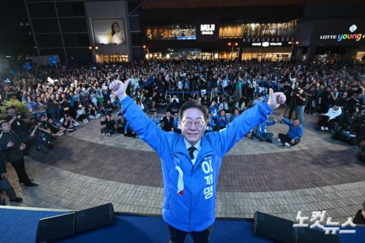 이재명 더불어민주당 대선 후보가 13일 울산 남구 롯데백화점 광장에서 열린 울산 집중유세에서 시민들과 기념촬영을 하고 있다.