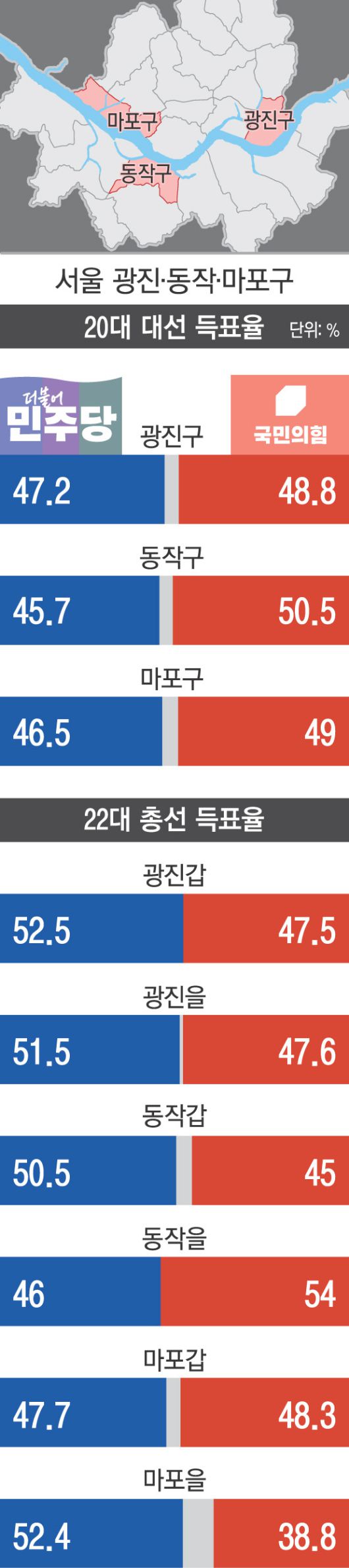 한강을 따라 형성된 서울 8개 구(마포·용산·성동·광진·동작·영등포·강동·중구)의 13개 선거구를 일컫는 ‘한강벨트’는 선거 때마다 각 정당의 승부처가 되는 곳이다. 부동산과 세제 정책에 민감하면서도 특정 정치 성향에 치우치지 않은 중도층이 많이 분포돼 있어 선거 승패의 가늠자로 불린다.