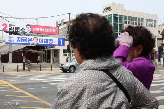 동작구 민심, 어디로 향할까 13일 서울 동작구 노량진동 일대에 이재명 더불어민주당 대선 후보와 김문수 국민의힘 대선 후보의 선거 현수막이 걸려 있다. 한수빈 기자 |