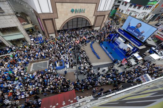 “재명이가 남이가” 이재명 더불어민주당 대선 후보가 13일 대구 동성로에서 열린 집중유세에서 시민들을 향해 지지를 호소하고 있다. 박민규 선임기자 |