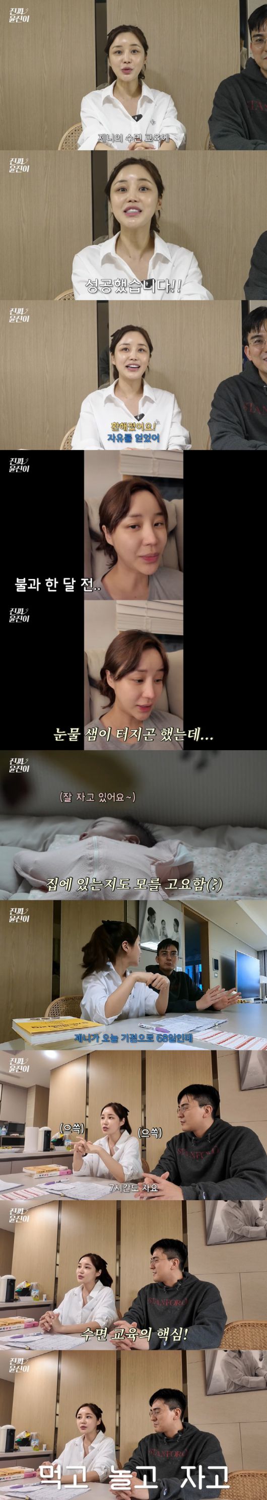 영상 속 윤진이는 "드디어 제니의 수면 교육에 성공했다"며 박수를 치며 함박웃음을 지었다. 이에 남편은 "자유를 얻었다"고 했고, 제작진은 "환해졌다"며 거들었다.