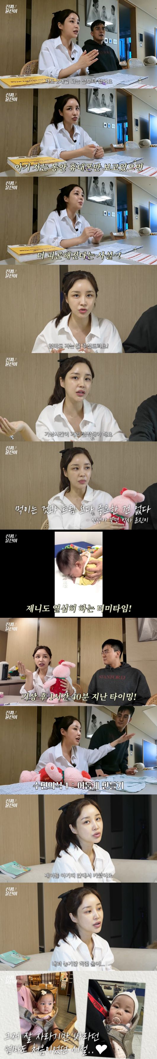 이어 윤진이는 "분리수면도 했다. 제니가 오늘 기점으로 68일인데 거의 6시간 자고 7시간도 잔다"며 "수면 교육의 핵심은 먹고 놀고 자는 거다"고 말했다.
