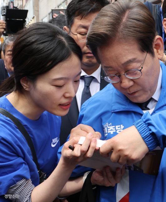 시민 책에 저자 사인 이재명 더불어민주당 대선 후보가 13일 대구 동성로에서 열린 집중유세를 마친 뒤 한 시민의 요청에 자신의 저서에 사인을 하고 있다. 박민규 선임기자 parkyu@kyunghyang.com |