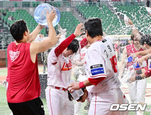 경기를 마치고 최정의 500홈런 축하 물세례가 진행되고 있다. 2025.05.13 / rumi@osen.co.kr