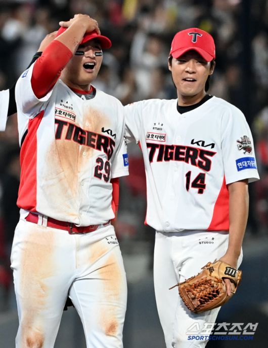 13일 광주KIA챔피언스필드에서 열린 롯데와 KIA의 경기, 9회초 2사 만루 KIA 1루수 변우혁이 롯데 레이예스의 타구를 막아내며 경기를 끝낸 후 기뻐하고 있다. 광주=허상욱 기자wook@sportschosun.com/2025.05.13/