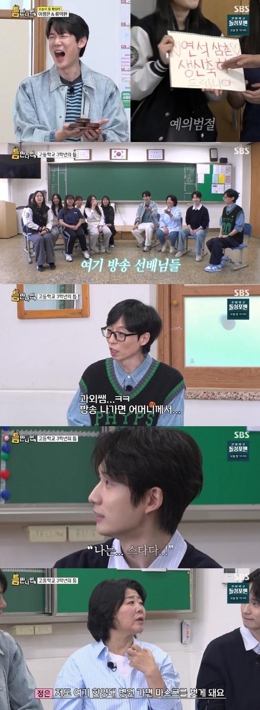 현재 고3이라는 '틈 주인'은 목표를 묻자 "지금은 대입이 목표다. 하고 싶은 게 많긴 한데 요즘 생각하는 건 미디어학과다. 방송 PD도 생각하고 있다"고 말했다. 이에 유연석은 "우리 (방송) 쪽으로 올 수도 있겠다. 여기 선배님들 계신다"며 제작진을 가리켰다. 그러자 유재석은 "겉으로 보기에는 그렇지만 저 안에 들어가 보면 아비규환이다. 마음 단단히 먹어라"라며 뼈 있는 조언을 했다.