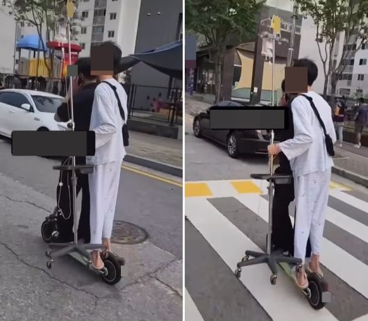 전동 킥보드 한 대에 사람 두 명이 안전모도 쓰지 않은 채 탑승해 주행하는 영상이 확산해 온라인상에서 논란이 일었다. 특히 영상 속 운전자는 한 손으로는 통화 중이었으며, 뒤에 탑승한 남성은 환자복을 입은 채 한 손으로는 링거 거치대를 들고 있어 더욱 네티즌들의 지적을 받았다.