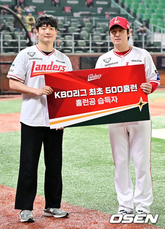 경기를 마치고 최정이 500홈런 홈런공 습득한 팬과 기념 촬영하고 있다. 2025.05.13 / rumi@osen.co.kr