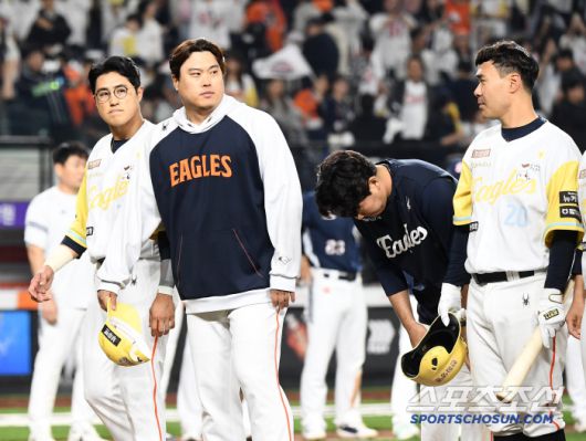 13일 대전 한화생명볼파크에서 열린 두산-한화전. 연장 11회 승부끝에 3대4로 패한 한화 선수들이 관중에게 인사하고 있다. 류현진이 시원섭섭한 표정을 짓고 있다. 대전=정재근 기자 cjg@sportschosun.com/2025..5.13/