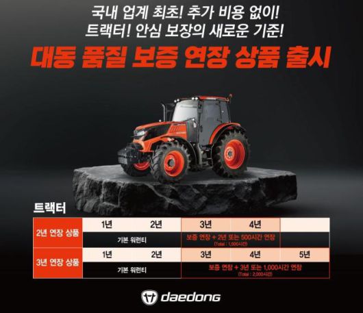 대동은 업계 최초로 대동의 트랙터, 스키드로더 주요 부품의 품질 무상 보증 기간을 최대 3년까지 연장할 수 있는 ‘워런티(품질 보증) 연장 플러스’를 출시했다. [사진=대동] |