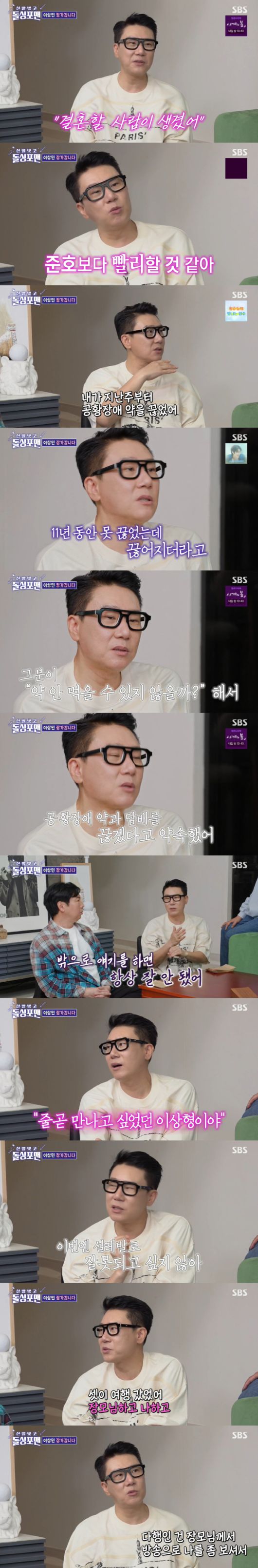 그러나 이상민은 "결혼한다. 준호 보다 빨리할 것 같다. 결혼할 사람이 생겼다"며 환하게 웃었다. 이어 그는 "나도 지금 울렁거린다. 지난 주부터 공황장애 약을 끊었다. 어떤 상황에서도 못 끊었던 약이 끊어지게 되더라"며 "나한테 '술, 담배, 공황장애 약을 이제 안 먹을 수 있지 않을까'라고 해서 '공황장애 약과 담배를 끊겠다'고 약속을 했다"고 말해 눈길을 끌었다.