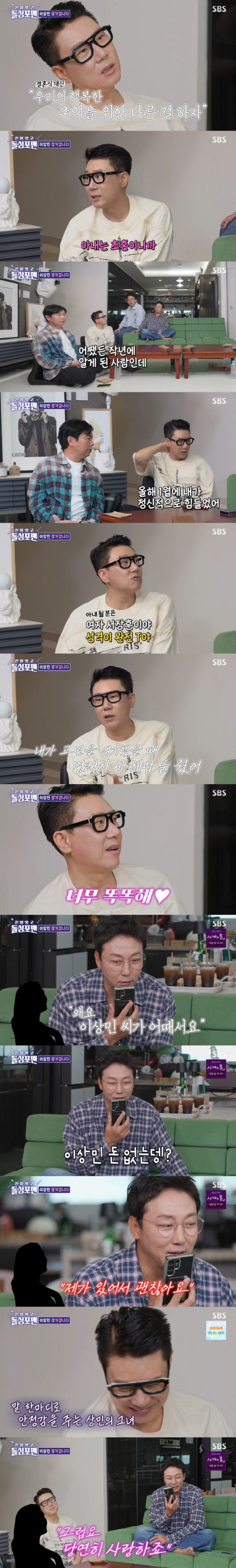이상민은 "작년에 알게 된 친구다. 1월 달에 정신적으로 힘들었다. 여자 서장훈이다. 완전 T다"면서 "내가 고민을 이야기 했을 때 명쾌하게 해답을 줬다"며 반한 이유를 밝혔다. 이어 그는 "'똑띠'라고 부른다. 너무 똑똑하다. 나의 모든 걸 다 해결해준다. 머릿 속 고민들을 아무 것도 아니게 만들더라. 나를 품을 산 같은 사람"이라며 아내를 향한 애정을 드러냈다.