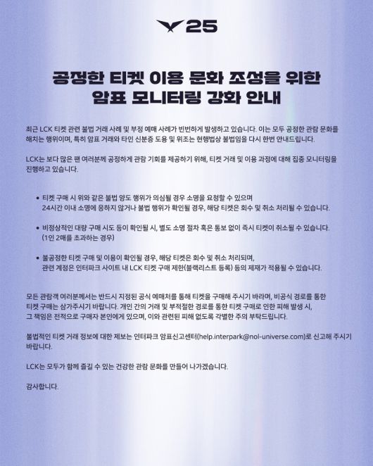 최근 LCK 티켓과 관련한 불법 거래 및 암표 사례가 반복적으로 발생하자 라이엇게임즈가 LCK의 공정한 티켓 이용 문화 정착을 위해 강력한 조치를 예고했다.