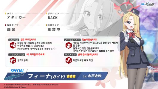 피나(가이드)의 상세 정보는 13일 공식 SNS로 밝혀졌다. 폭발 속성의 스페셜 딜러다. 비교적 최근 추가된 마키(캠핑)과 동일한 단일 딜러로 설계됐다. 서로 같은 단일 딜러지만, 맡은 역할은 다르다.