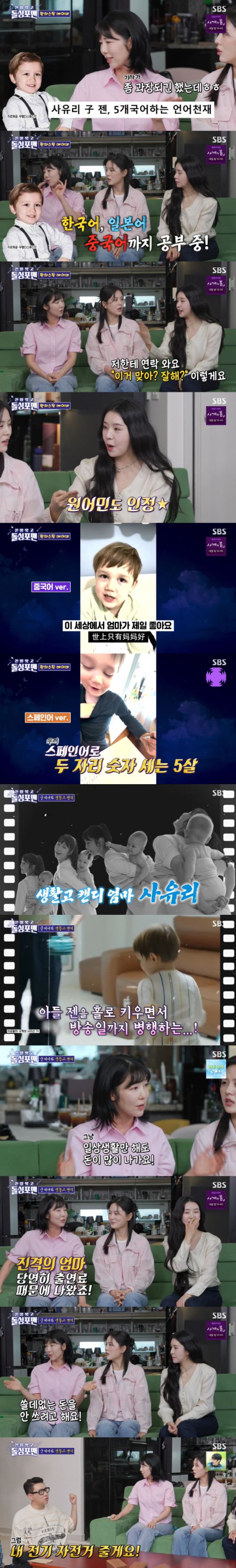 이후 중국어로 노래를 부르고 스페인어로 두자리 숫자를 세는 5살 젠의 모습이 공개돼 눈길을 끌었다. 사유리는 "본인이 좋아해서 하는 거다. 싫어하면 못한다"고 했다.