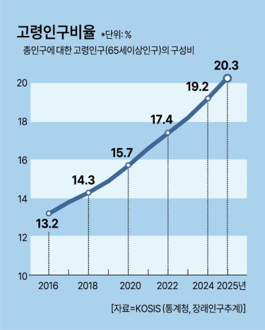 13일 통계청에 따르면 한국의 65세 이상 고령 인구는 2024년 기준 전체 인구의 19.2%를 차지하고 있으며, 2025년에는 ‘초고령사회’(고령 인구 비중 20% 이상)에 진입할 것으로 전망된다. 내년에는 국민 5명 중 1명이 65세 노인인 셈이다.