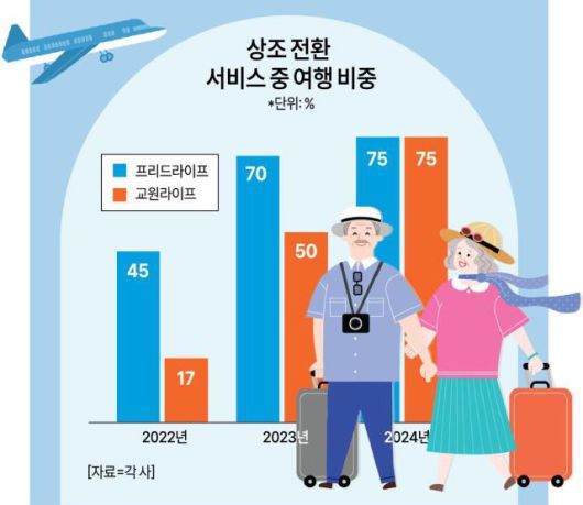 프리드라이프가 분석한 데이터에 따르면 가입한 시니어 고객들이 주로 이용한 전환 서비스와 관련해 전체 전환 서비스 이용 고객 중 약 65%가 프리드라이프가 제공하는 각종 투어 패키지 상품을 이용한 것으로 나타났다. 전환 서비스 이용 건수에서 여행 서비스가 차지하는 비중은 2022년 45%, 2023년 70%, 2024년 75%로 지속적으로 늘고 있다.