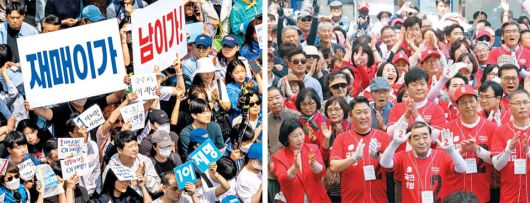 6·3 대선 공식 선거운동 이틀째인 13일 이재명 더불어민주당 후보가 대구 동성로에서 연설을 하는 가운데 지지자들이 ‘재매이(‘재명이’의 경상도식 발음)가 남이가’라고 적힌 손팻말을 들고 있다(왼쪽 사진). 같은 날 김문수 국민의힘 후보가 울산 중구 뉴코아아울렛에서 유세하는 모습을 지켜보며 지지자들이 박수와 환호를 보내고 있다. /남강호·김지호 기자 |