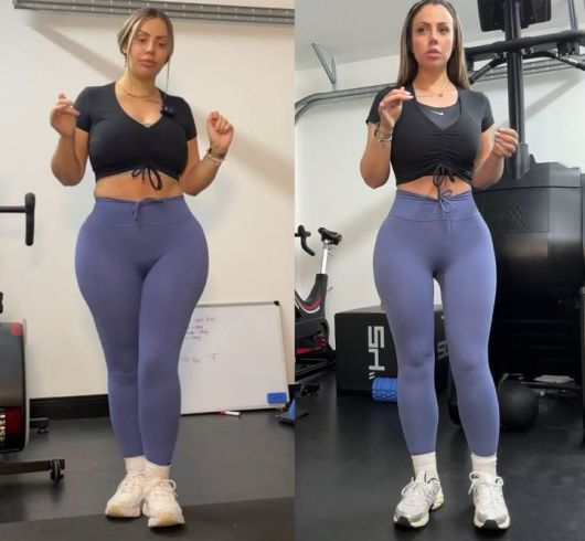사진 속 헤이건은 양쪽이 같은 옷을 입고 있지만, 겉모습이 크게 다르다. 특히 하체 근력 운동으로 허리와 허벅지 등의 살이 많이 빠진 것으로 보인다.