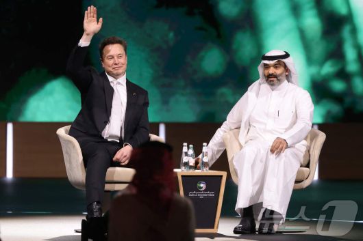 일론 머스크 테슬라 최고경영자(CEO)가 13일(현지시간) 사우디아라비아 리야드에서 열린 '사우디-미국 투자포럼'에 참석해 손을 들어보이고 있다. 2025.05.13. ⓒ AFP=뉴스1